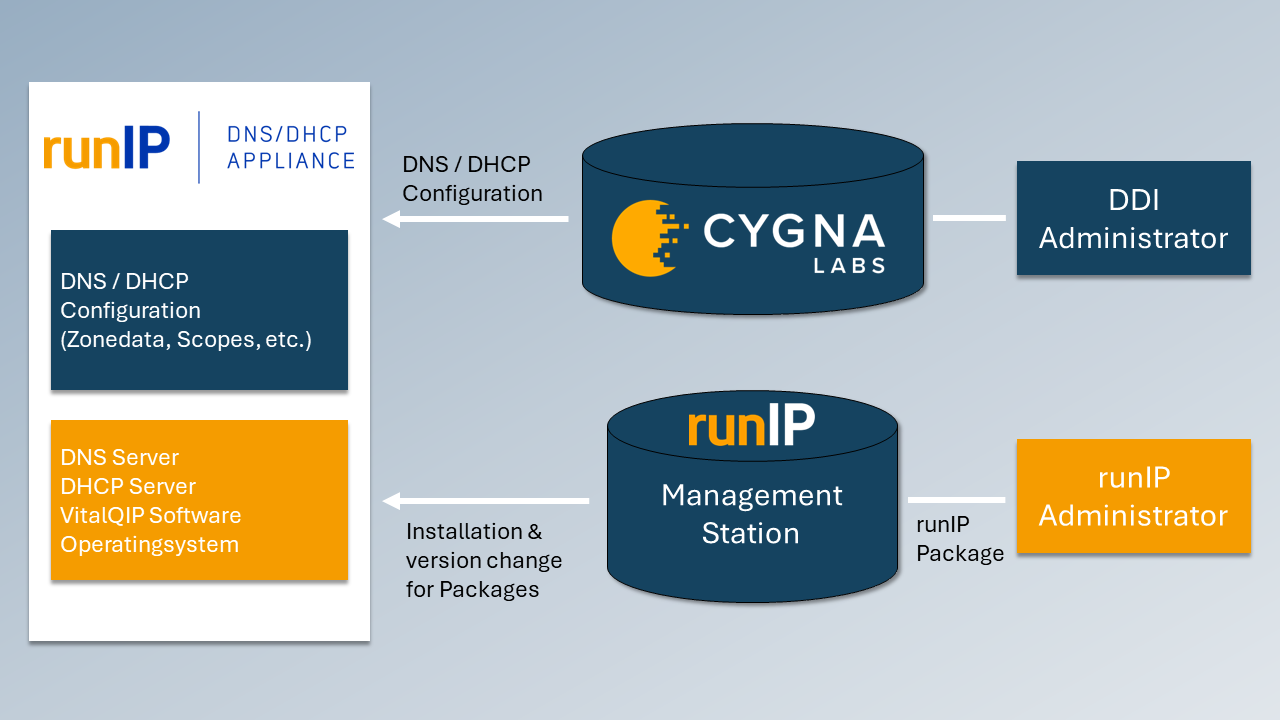 The overhead of a traditional approach is eliminated, as well as the administrative overhead of coordination various groups such as change management with product, server and security managers. runIP transfers the renowned efficiency and flexibility of your DDI-Solution in the administration of IP Addresses to managing the software and version levels on individual DNS & DHCP servers.