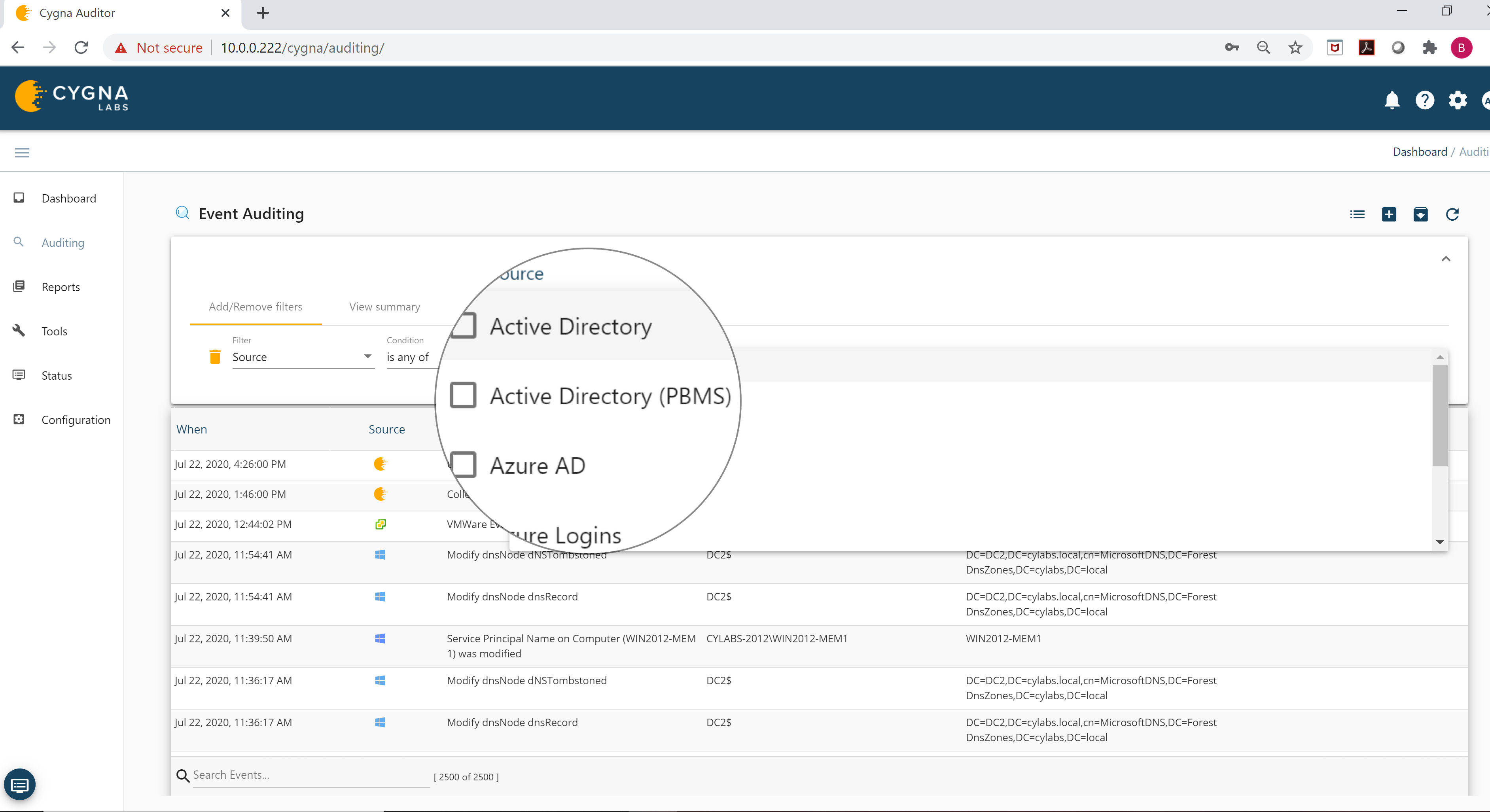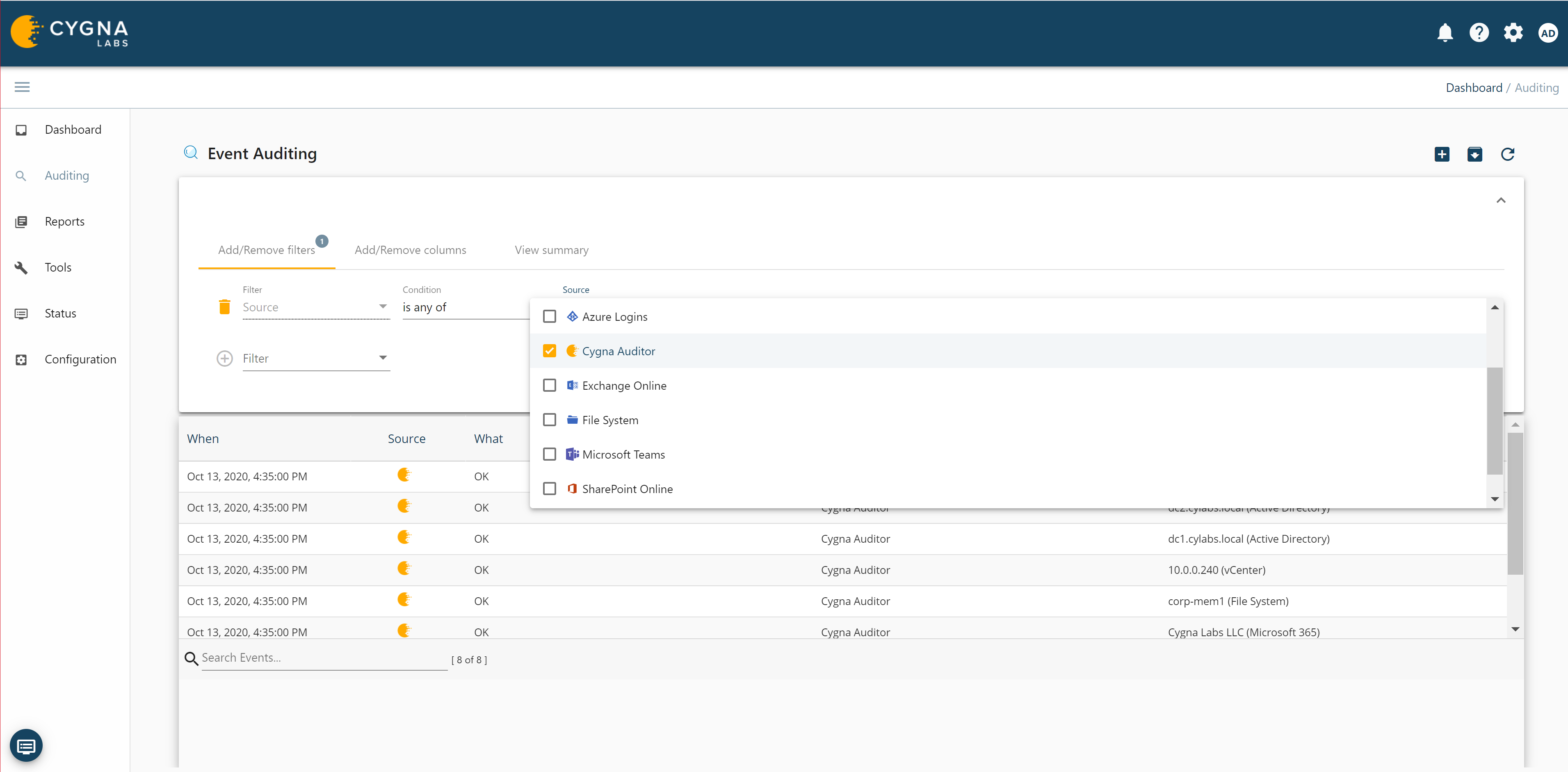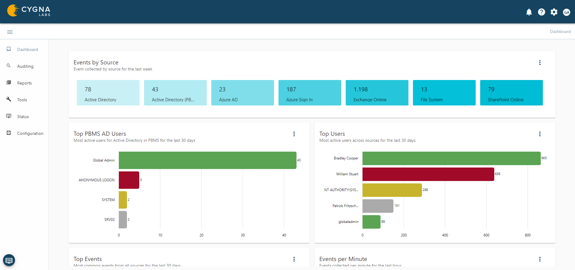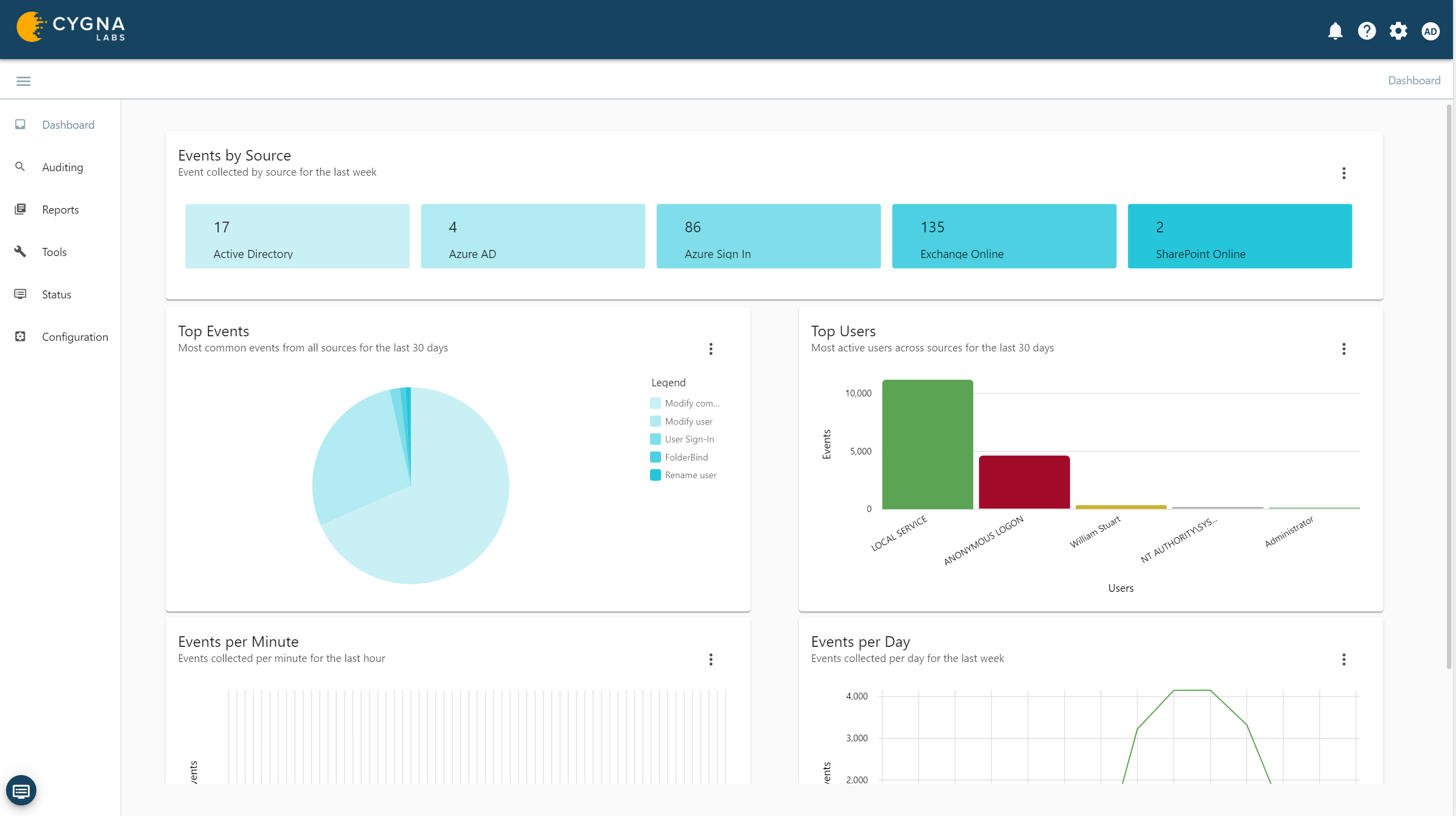 Auditieren Sie Active Directory, Windows Filesysteme, SQL-Server, NetApp, Exchange, Azure AD und Office-365 über eine gemeinsame integrierte Plattform. Der Cygna Auditor skaliert nach oben, um die Anforderungen der größten Unternehmen abzudecken, ist aber gleichzeitig so einfach zu installieren und in Betrieb zu nehmen, dass er sich auch für kleinere Umgebungen bestens eignet.