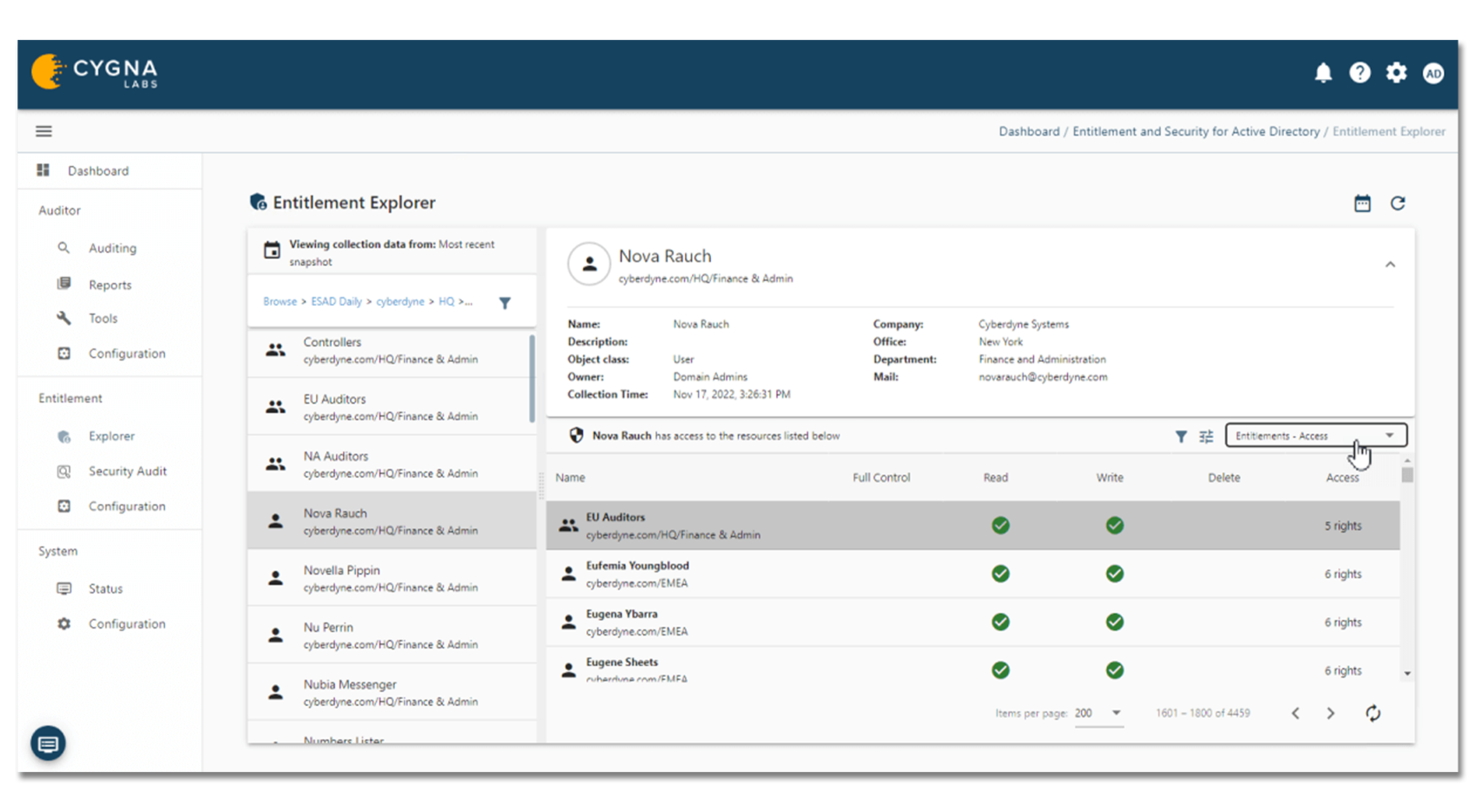 Active Directory (AD) ist der wichtigste Bereistellungsdienst für Authentisierungs- und Autorisierungsfunktionen der meisten Organisationen jeder Größe. Es wird häufig synchronisiert, um den Zugriff auf Cloud-Anwendungen und -Ressourcen zu ermöglichen. AD-Sicherheitsprobleme können zu kostspieligen Serviceunterbrechungen und möglicherweise zu Datenverlusten oder zur Nichteinhaltung von gesetzlichen Vorschriften führen. Unternehmen sind deshalb darauf angewiesen, dass die entsprechenden AD-Berechtigungen definiert sind, um die Sicherheit und damit den Geschäftsbetrieb zu gewährleisten. Eine manuelle Überwachung ist selbst in kleinen Umgebungen kaum zu bewältigen. Cygna Labs Entitlement and Security for Active Directory bietet die Möglichkeit, die aktuellen oder zurückliegenden AD-Berechtigungen und Gruppenzugehörigkeiten zu erfassen und zu reporten.