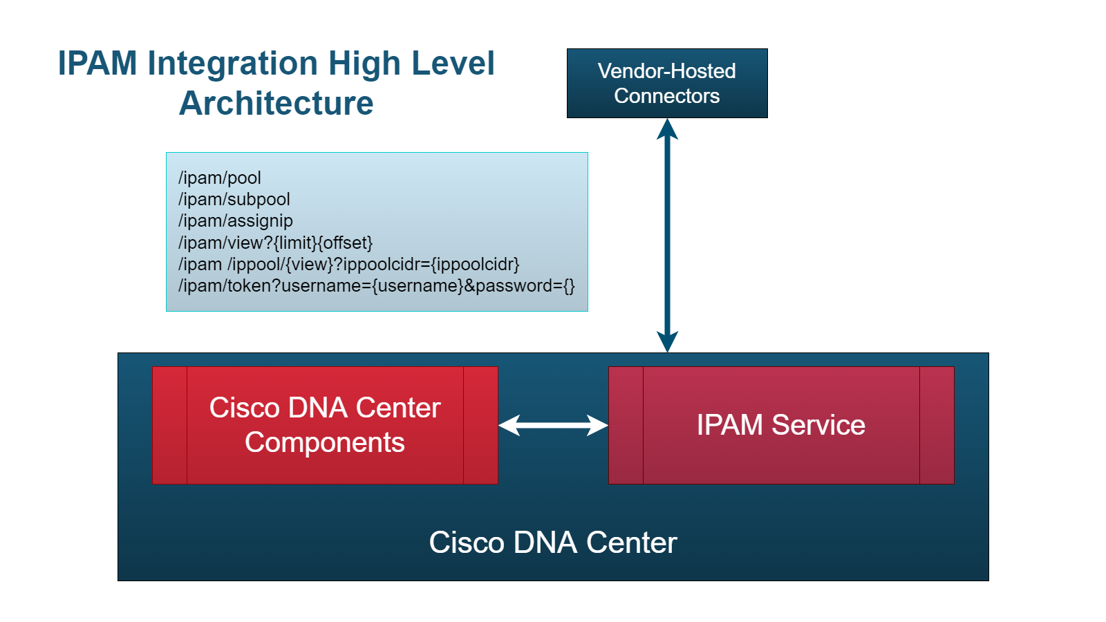 Cisco DNA Center ermöglicht die Integration mit externen IPAM-Anbietern in ihrem Netzwerkmanagement-Dashboard, das zur Verwaltung von IP-Adresspools, Sub-Pools und Geräten verwendet wird. VitalQIP 21 bietet die notwendige, von Cisco spezifizierte REST API, um die IPAM-Integration zu ermöglichen. Diese REST API bietet die Möglichkeit, IPv4- und IPv6-Infrastrukturen in VitalQIP abzufragen, zu ändern und zu löschen, die alle innerhalb des Cisco DNA Center Network IP Address Pools verwaltet werden. Cisco IPv4 und IPv6 Pools, Sub-Pools und Endgeräte werden auf VitalQIP IPv4 Netzwerke, IPv6 Blöcke, IPv4 und IPv6 Subnetze, IPv4 Objekte und IPv6 Adressen abgebildet. Um diese REST API-Schnittstelle in Cisco DNA Center verwenden zu können, muss der externe IPAM-Anbieter in den Cisco IP Address Manager-Einstellungen in Cisco DNA Center konfiguriert werden.