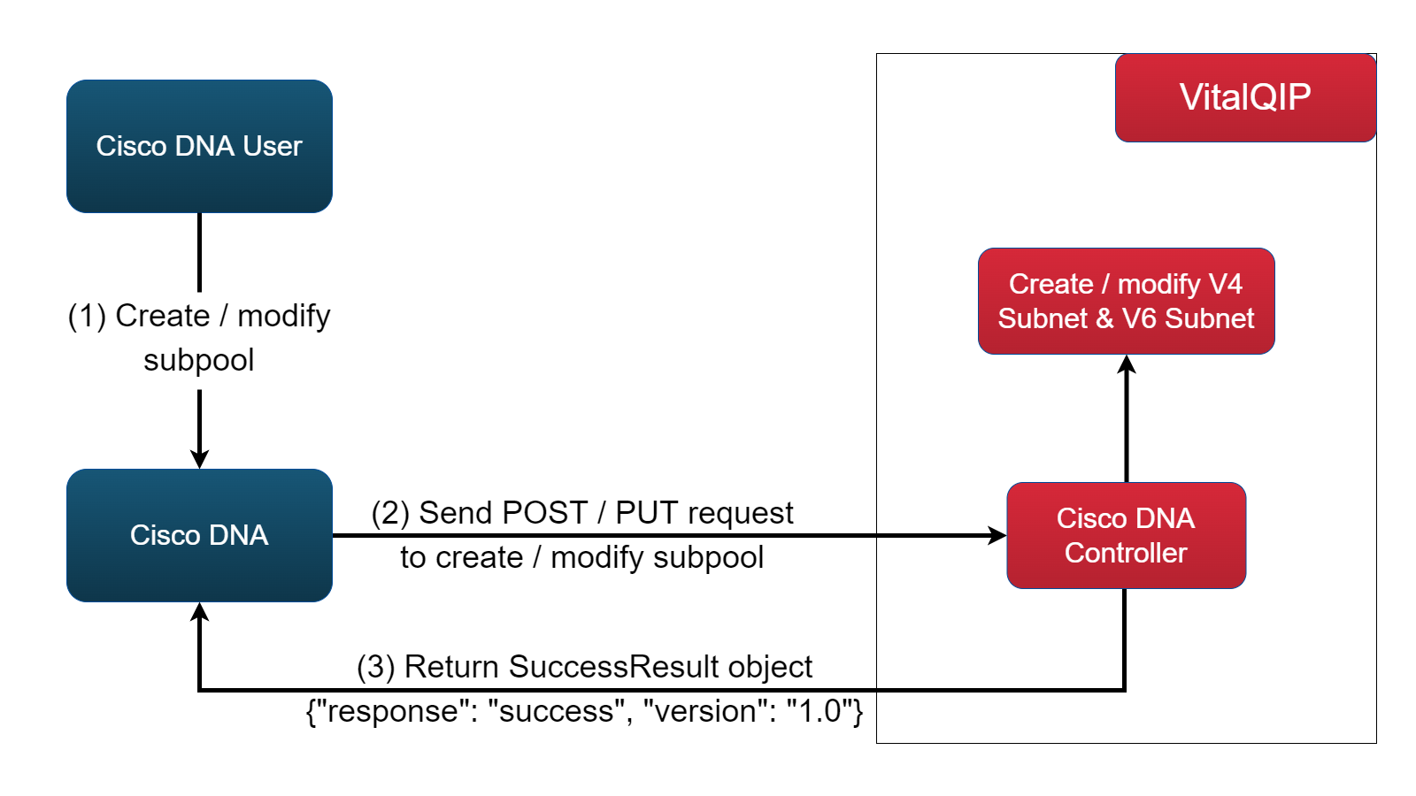 Workflow-Diagramm für die Erstellung von Pools in Cisco DNA Center und die anschließende Erstellung eines VitalQIP IPv4-Netzwerks oder IPv6-Blocks über eine spezielle REST-API, die in VitalQIP 21 und späteren Versionen verfügbar ist.
