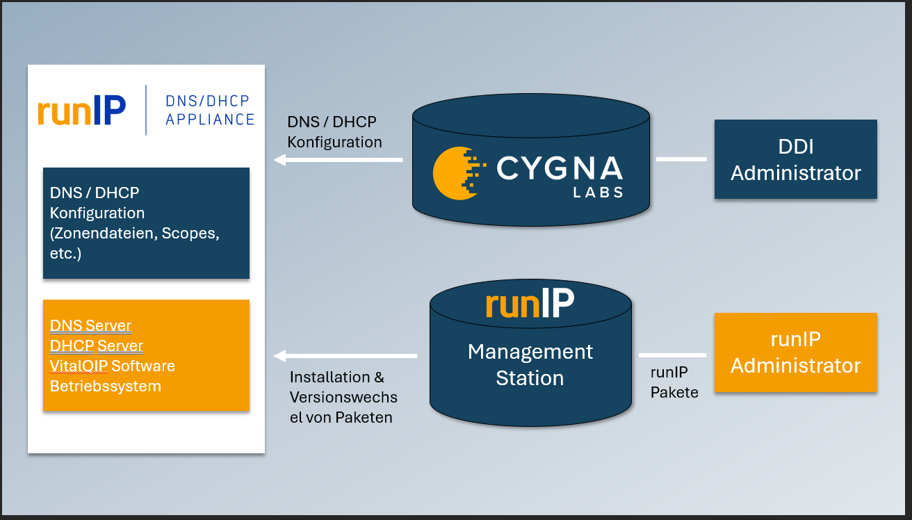 Der Aufwand, der bei einer herkömmlichen Vorgehensweise entsteht, sowie der administrative Overhead durch die Koordination verschiedener Gruppen wie des Change-Managements mit den Produkt-, Server- und Sicherheitsverantwortlichen werden eliminiert. runIP überträgt die bewährte Effizienz und Flexibilität Ihrer DDI-Lösung in der Verwaltung der IP-Adressen auf das Management der Software und Versionsstände auf den einzelnen DNS- & DHCP-Servern.