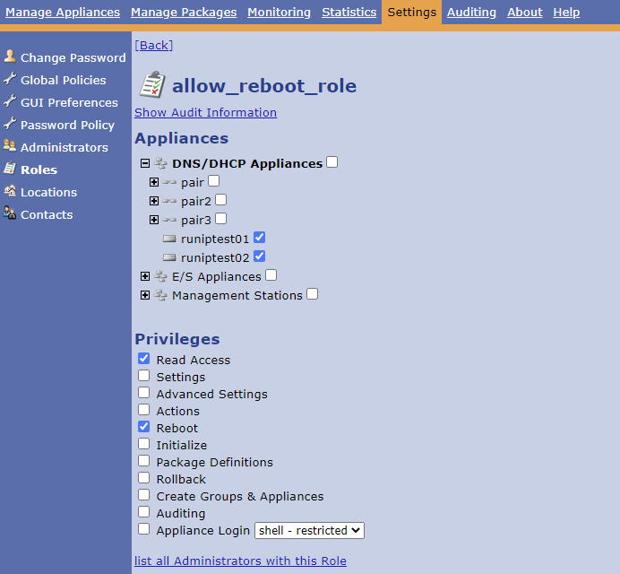 runIP verfügt über eine flexible Rechtevergabe auf Basis von administrativen Rollen. Pro Rolle wird für bestimmte Appliances beispielsweise festgelegt, ob ein Administrator berechtigt ist, Appliances zu booten, Einstellungen zu ändern oder Upgrades durchzuführen. Einzelnen Administratoren können dann beliebig viele Rollen zugewiesen werden. Auf diese Weise lassen sich leicht individuelle Rechte-Profile erstellen, die den operativen Anforderungen gerecht werden.